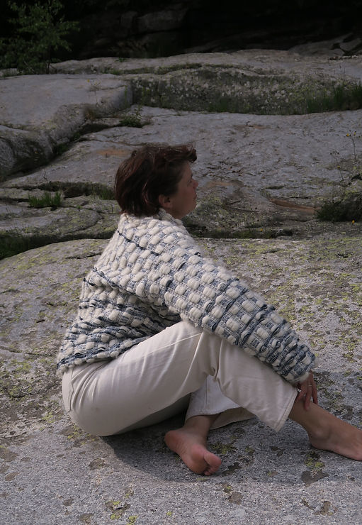 Coupée, et cousue main façon street-wear par Salomé Manzo à Florac, tissée main en laine de mouton par Justine Viala au Pont de Montvert, portée par Kahilabae, rappeuse de région parisienne et